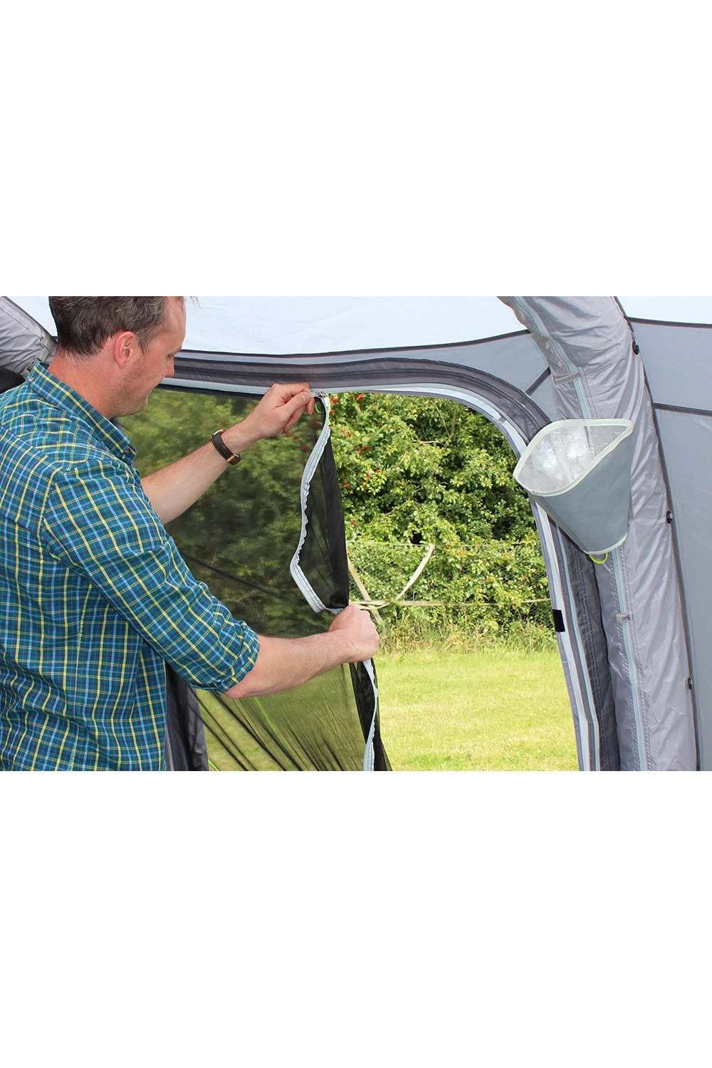• Internal living divider panel with zip-back door and mesh window with blind