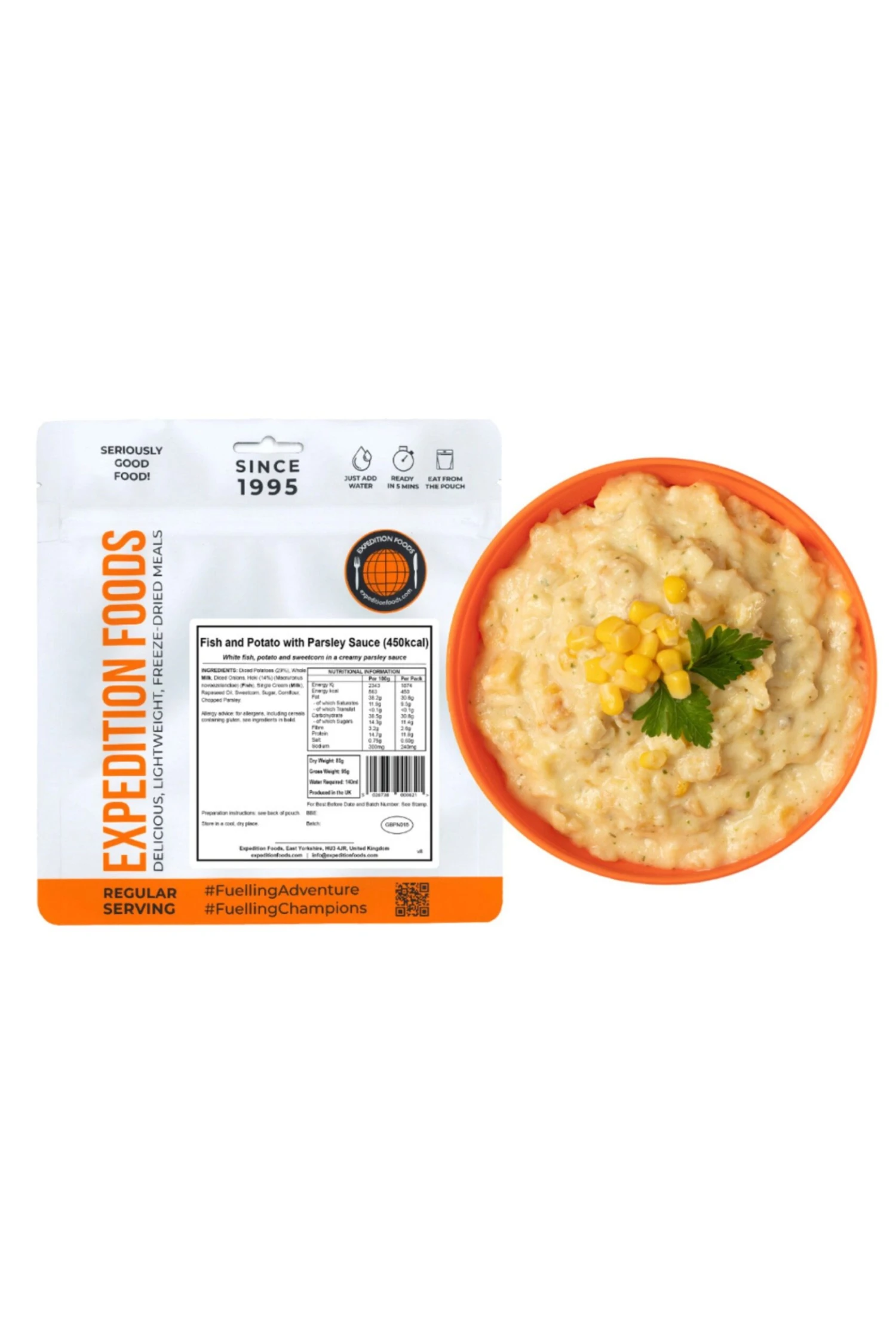 One of the most loved Expedition Foods meals, Fish and Potato with Parsley Sauce makes a delicious dish for both fish lovers and non-fish lovers. Made with white fish, the dish is creamy potatoes with just the perfect blend of ingredients. A soothing meal whether you are ice fishing in Siberia or battling a sand storm in Morocco, made to be enjoyed and to replenish those lost calories. Add hot water, stir, let sit for five minutes and voila, you have an unbelievable meal.