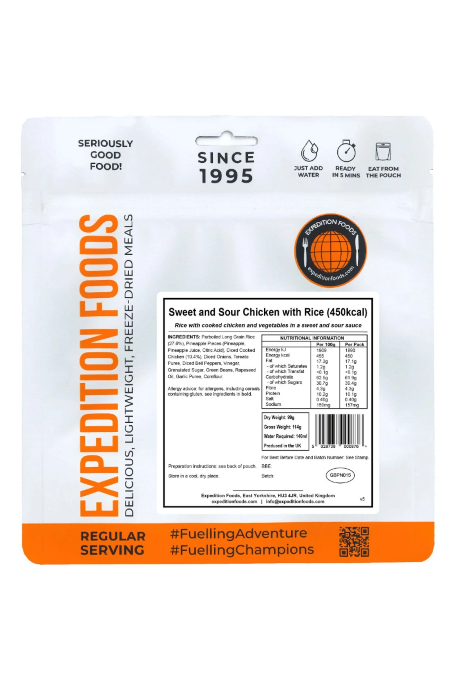Our Sweet and Sour Chicken with Rice meal is so good that you’ll put it on the permanent rotation. The chicken is coated in a sweet and sticky sauce mixed with pieces of pineapple and fluffy rice — baked to perfection. This classic meal has been one of the perennial favourites since Expedition Foods was founded in 1995. Add hot water, stir and wait five minutes. It won’t take you long to remember that this is one of your best-loved meals.