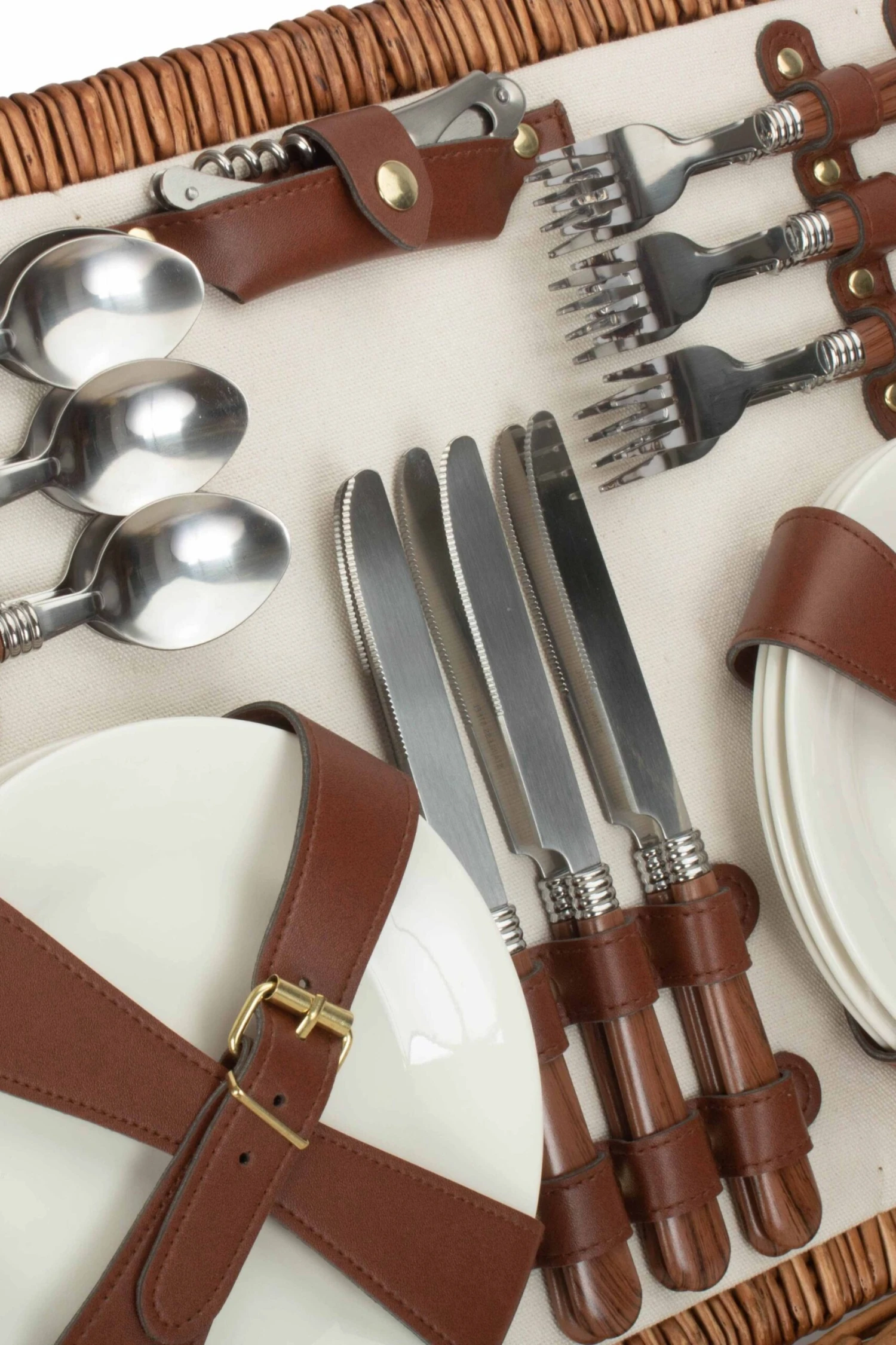 Basket contains fitted cooler bag, cutlery, plates, bottle opener, blanket and acrylic glasses.