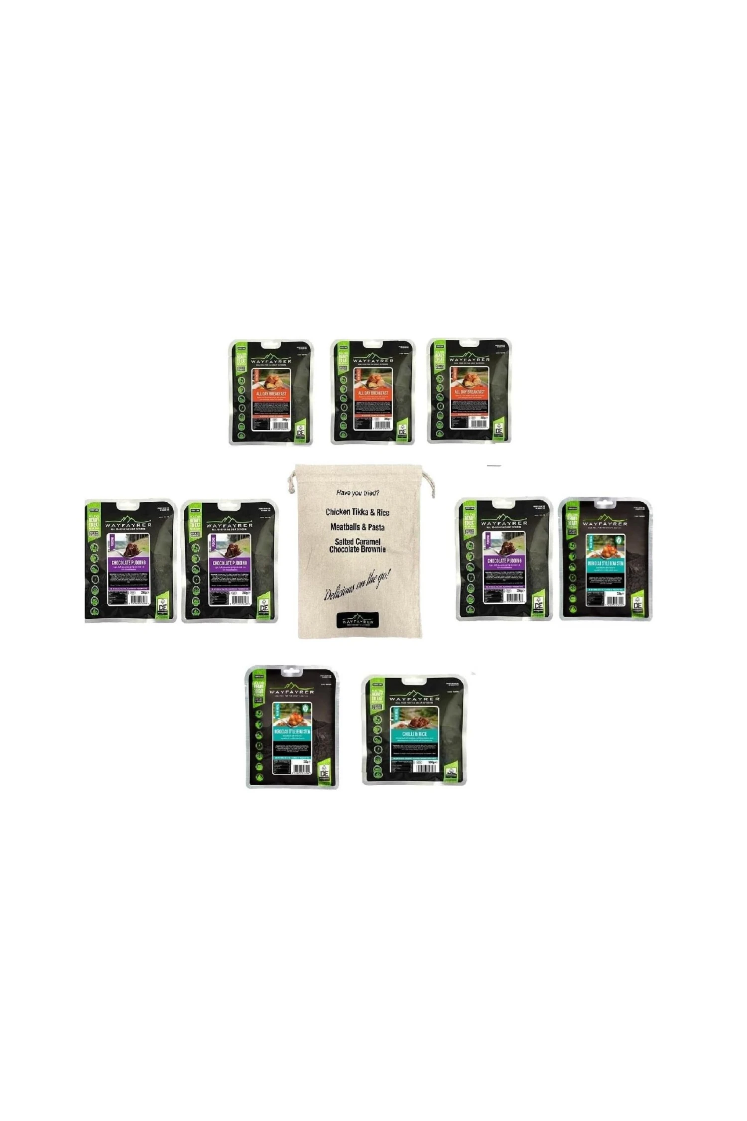Breakfast, Lunch, Dessert 9 pack Meal Kit with FREE carry bag. Three-night backpacking trip pack. These packs include three breakfasts, three dinners and three puddings, perfect for a three-night expedition. Wayfayrer meals are pre-cooked and provide a substantial meal, they can be eaten hot or cold making them an ideal option for Duke of Edinburgh participants as well as for taking for a well-deserved meal when you are enjoying your next climbing, hiking, camping or sailing adventure. Each Gold Pack comes with a FREE drawstring carry bag. Perfect for storing your meals on the go!