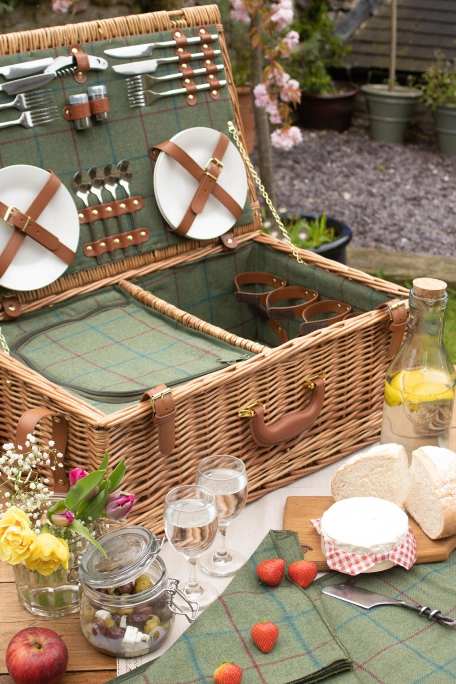 Contains china plates, salt and pepper, napkins, picnic blanket, wine glasses, bottle opener and cutlery.