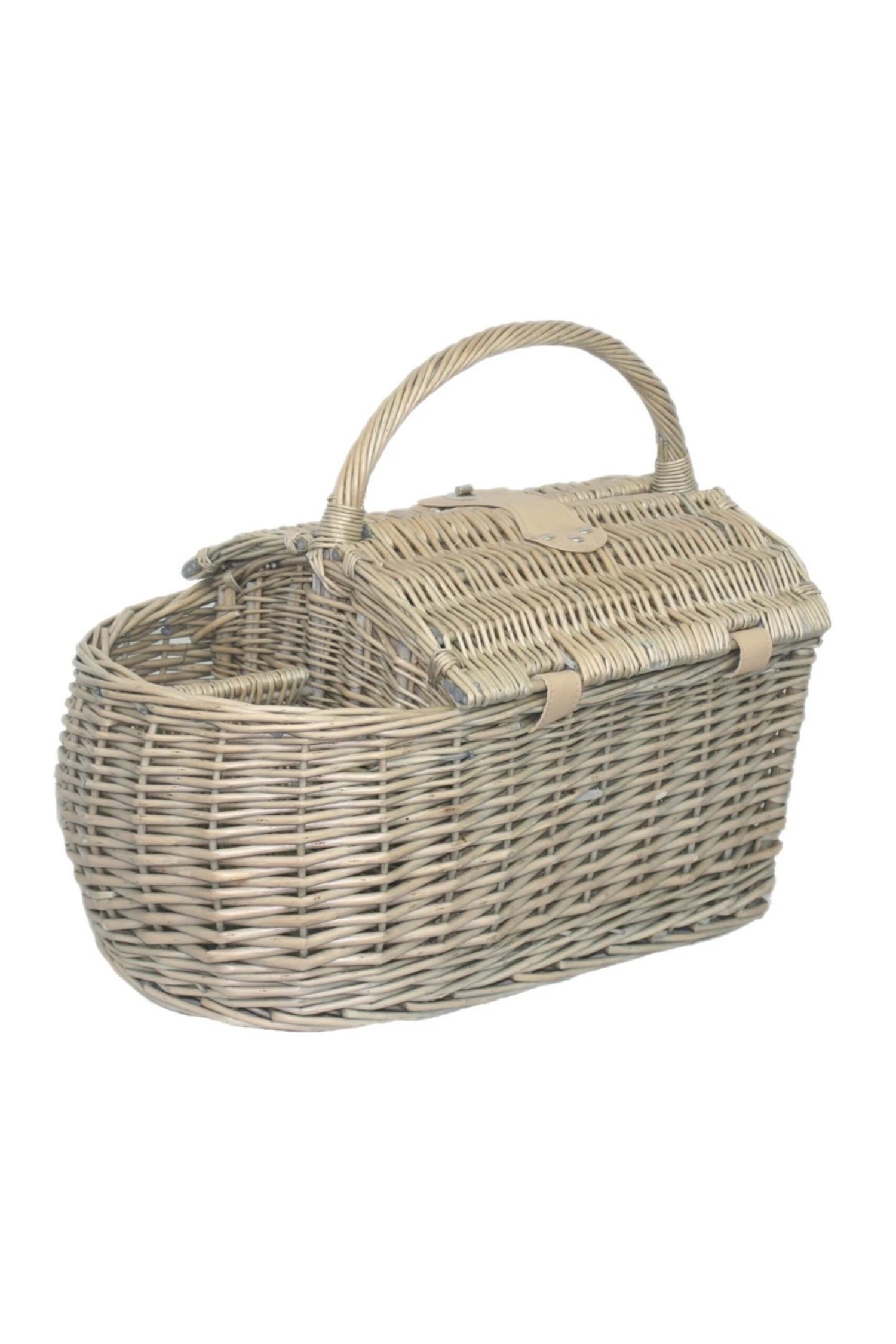 Two-person fully fitted picnic basket finished in a full buff antique wash finish willow cream faux leather.
