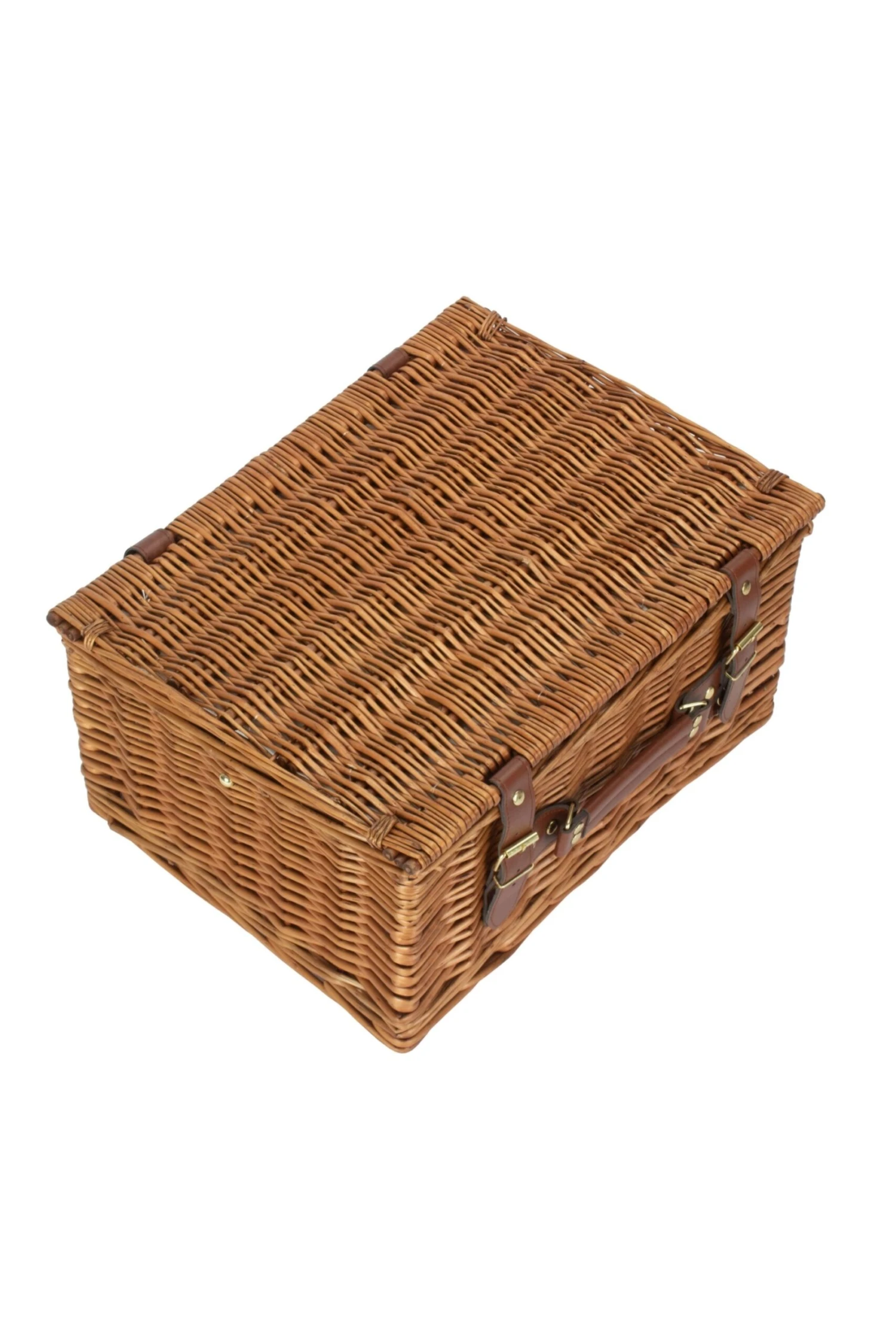 Four-person fitted picnic basket finished in full light steamed willow and tan faux leather handles.