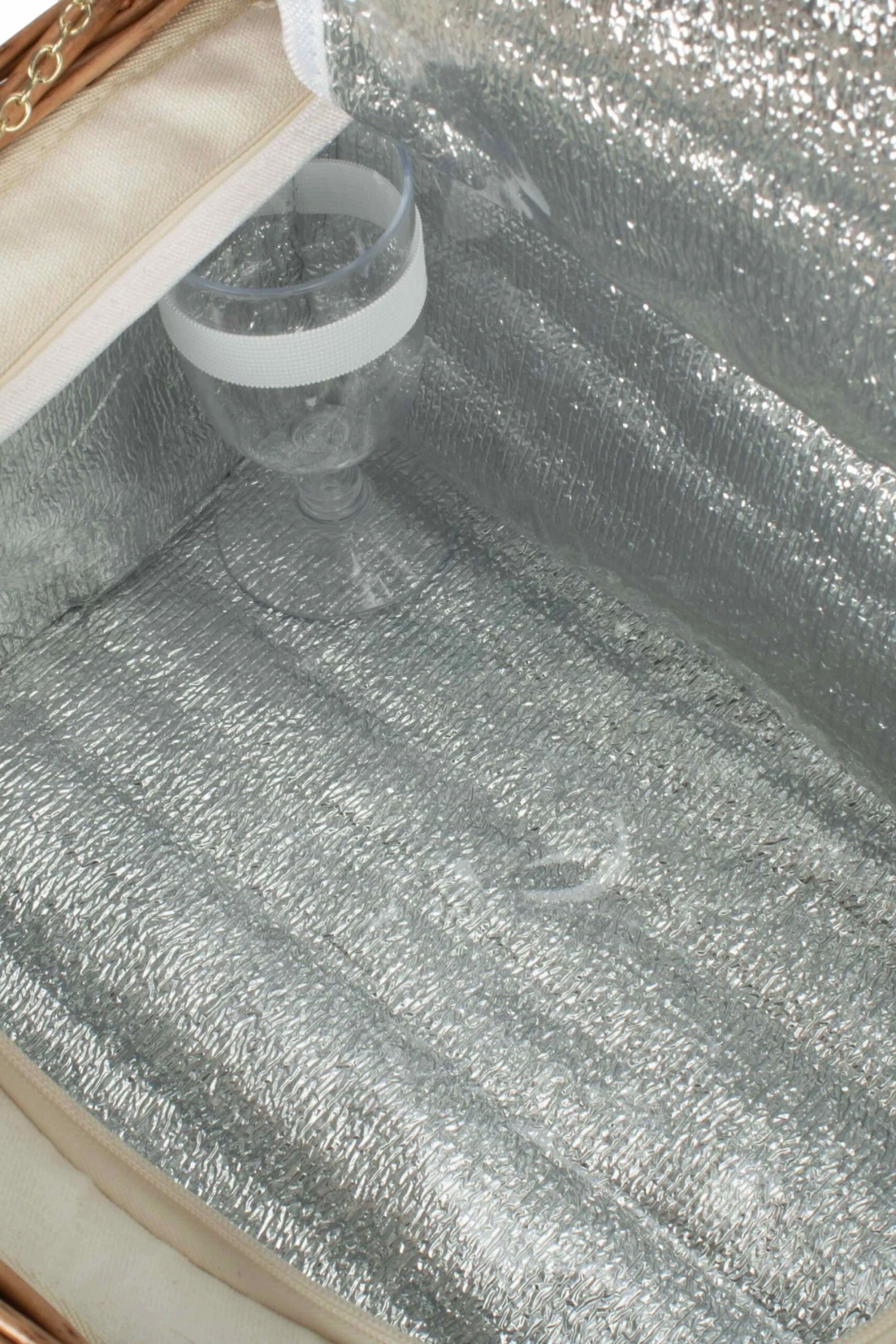 This basket contains a fitted cooler bag, cutlery, plates, bottle opener, blanket, and acrylic glasses.