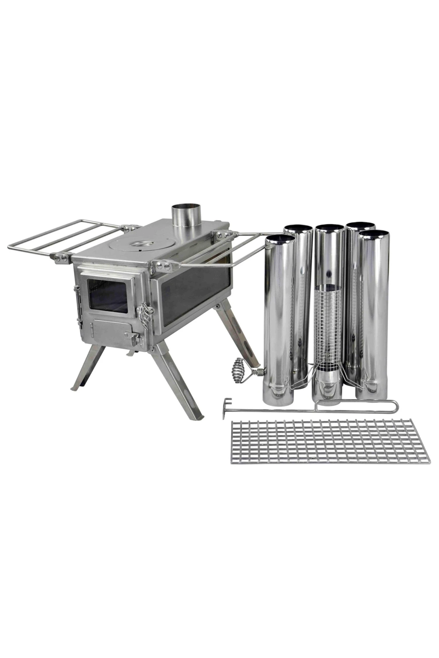 ● Includes 1 stove body, 4 sections of straight chimney pipe (2.1” diameter, 12” length), 1 airflow controller, 1 spark arrestor, 1 ash scraper and 1 grate