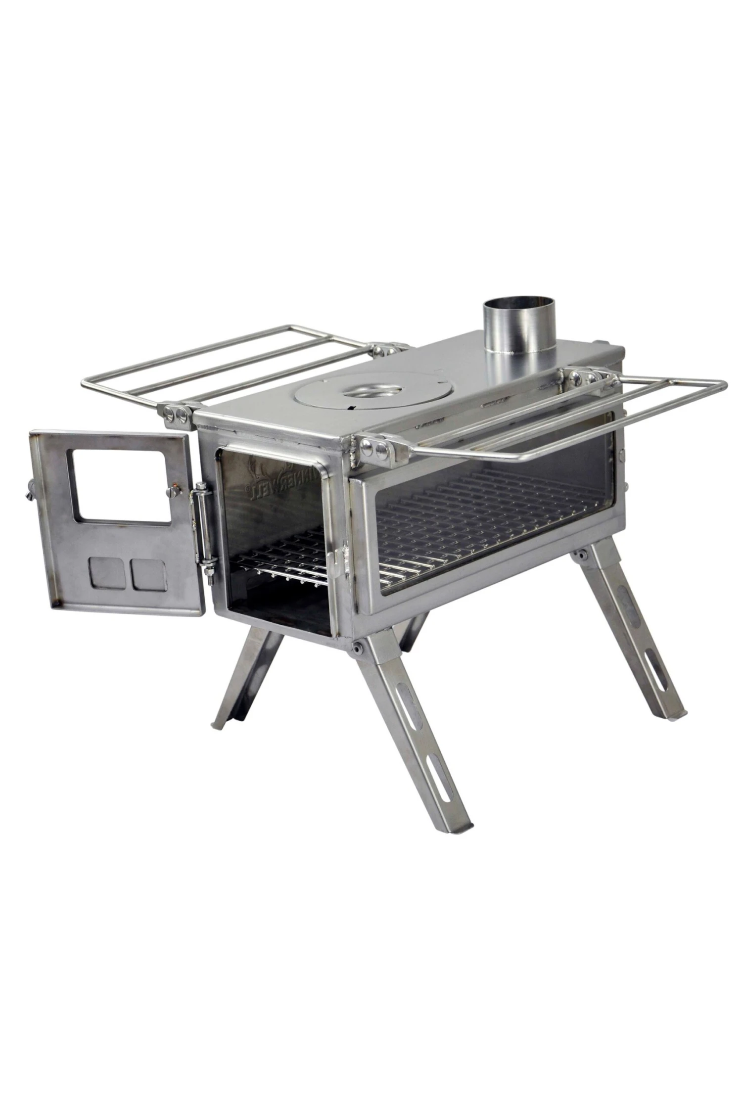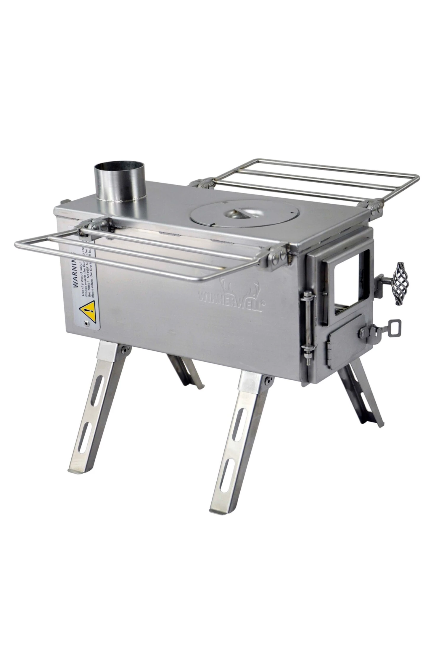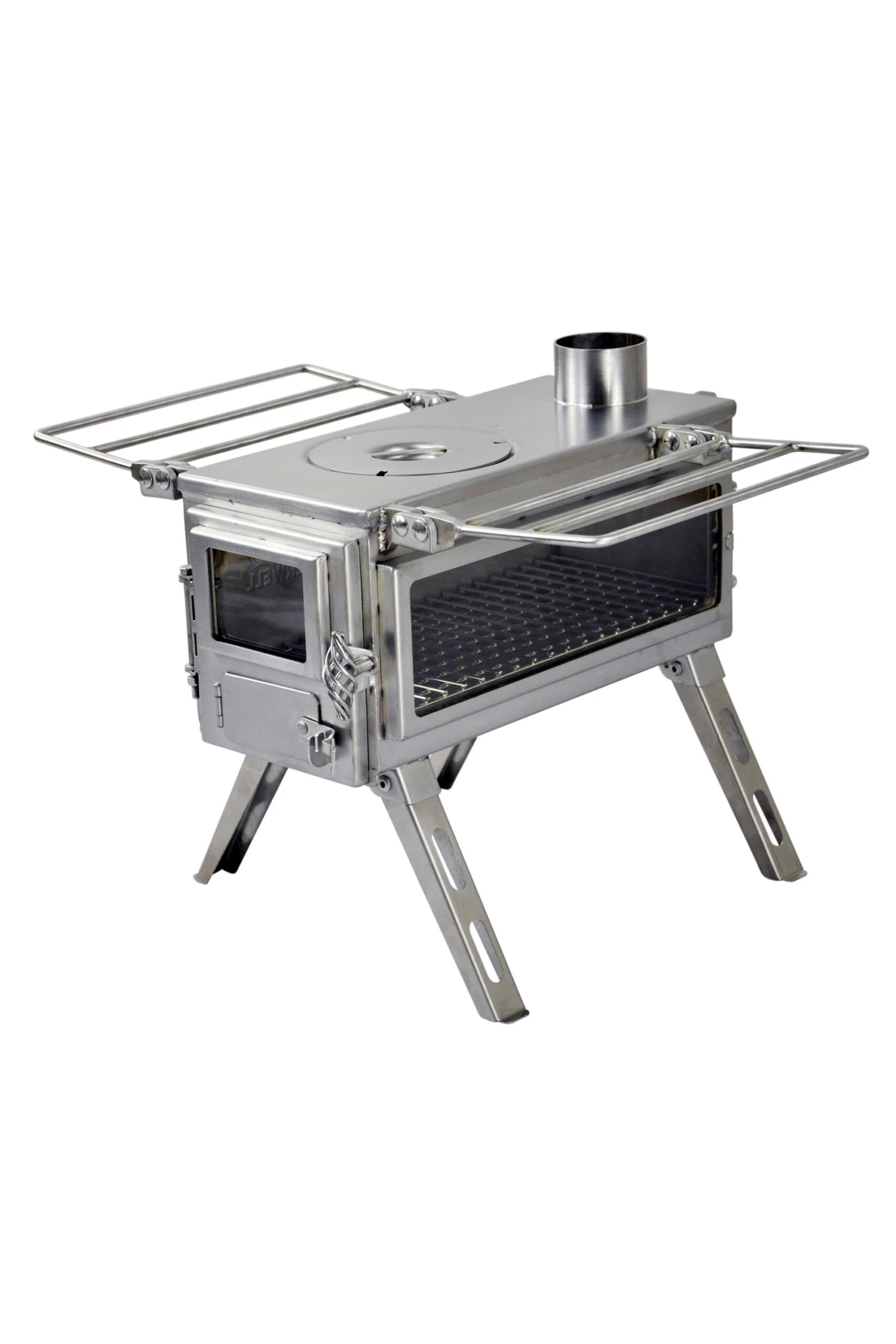 With its rectangular firebox, two viewing windows, and nesting 4-leg design, the Winnerwell Nomad View small wood burning camping stove is truly unique in the world of portable wood stoves. Made with quality 304 stainless steel, the Nomad View is an excellent heating and cooking solution in compatible tents and a range of recreational shelters. The nesting 4-leg design gives the Nomad a smaller footprint than the Woodlanders, making it a good option for small spaces where a fireproof hearth area is used to reduce required clearances.
