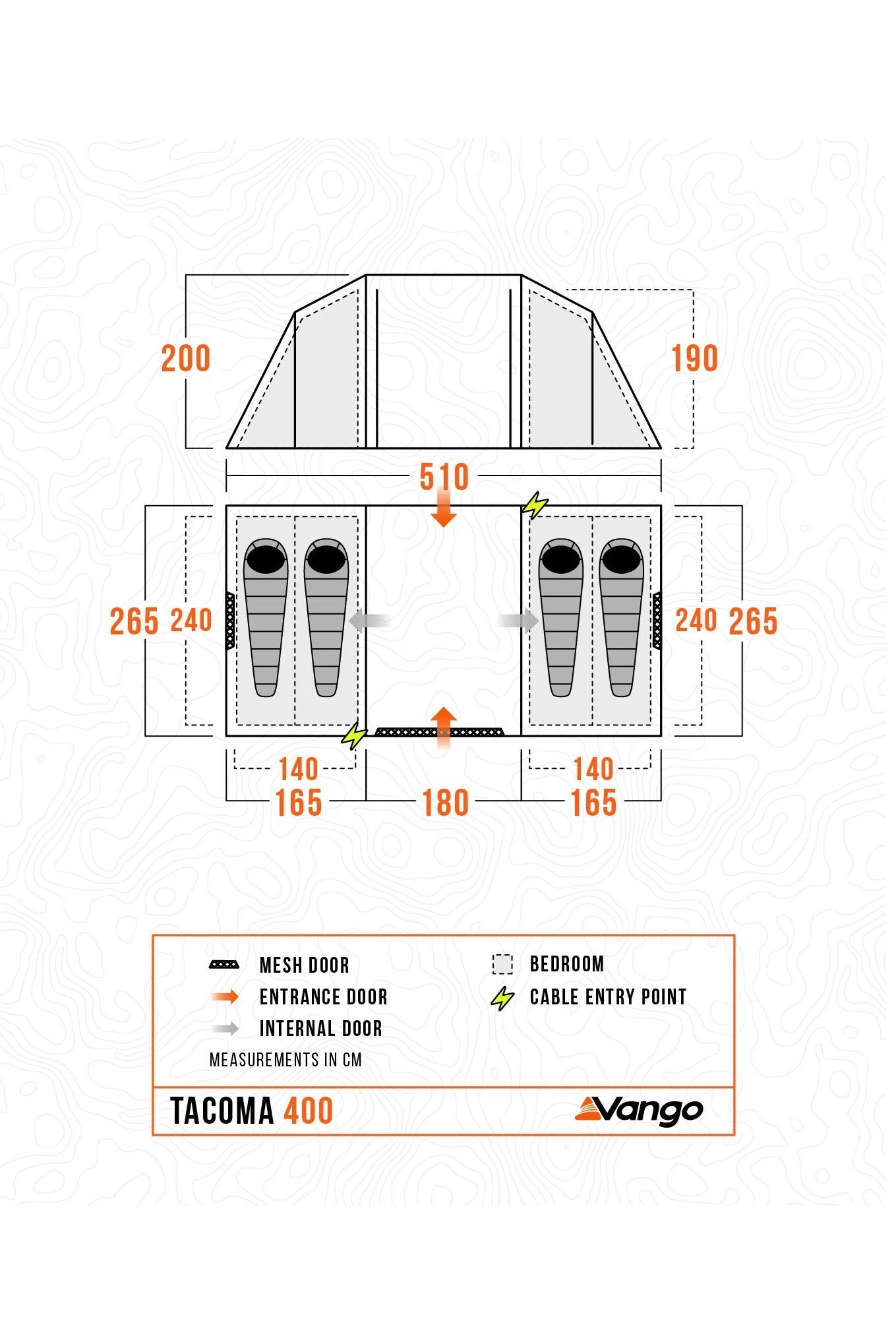 The Tacoma 400 is an 4-man Powerflex® Fibreglass poled tent with a vis-a-vis layout. Airflow vents have been incorporated into the design to increase airflow and ventilation. The Tacoma is designed specifically for campers who prefer more private sleeping areas, with a generous living area in the middle. The living space incorporates a large Diamond Clear window allowing light to pour into the living area during the day with the ability to cover with the roll-away toggled curtains at night. Dynamic Weave Fabric keeps pack size and weight low while ensuring Vango quality and durability. The optional side awning provides a functional porch that’s great for storing extra kit.