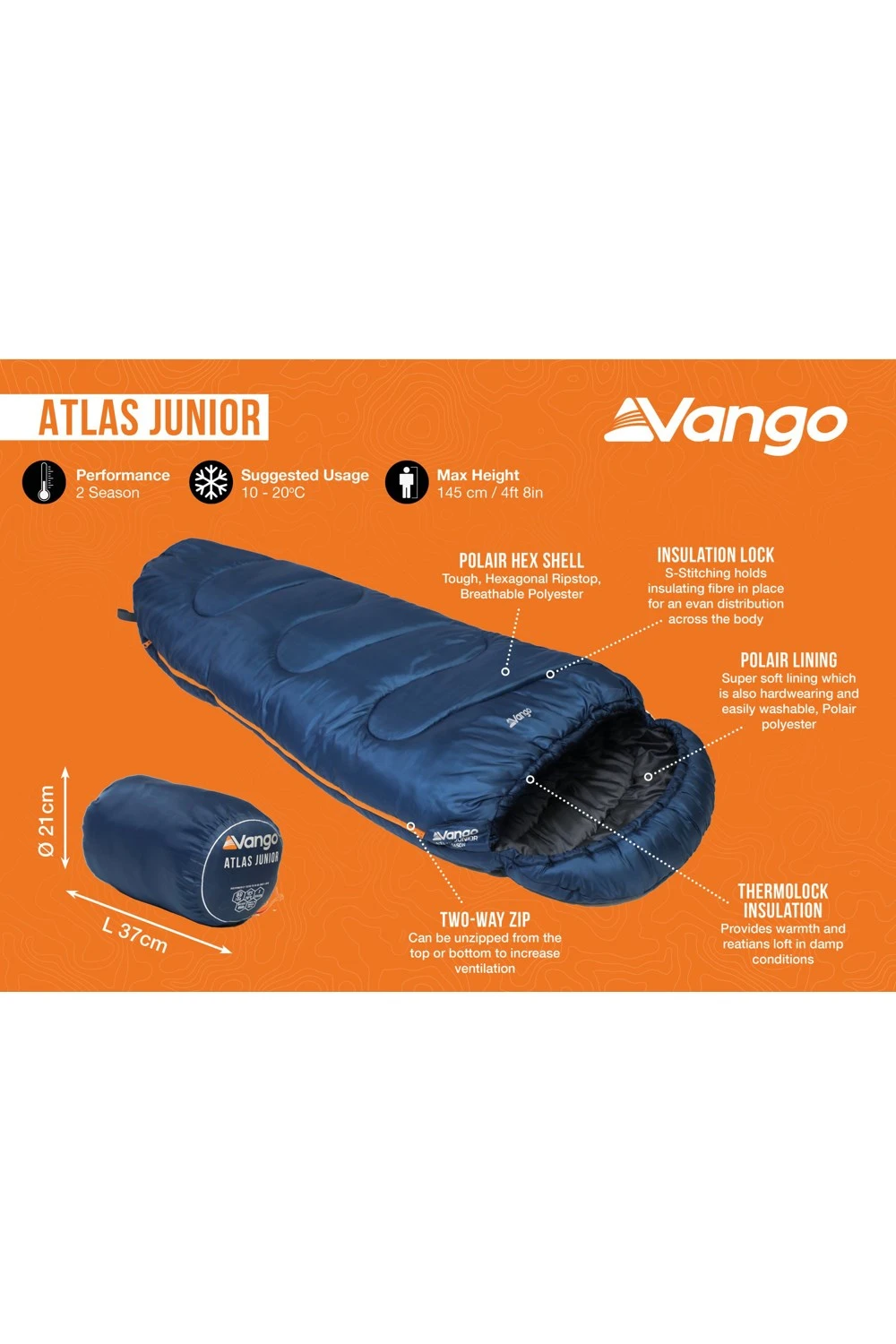 The Vango Atlas Junior Children’s Sleeping Bag in Ink Blue is perfect for young adventurers ready for their first camping experiences. A comfortable 2-season bag with a TOG of 8.5, it provides warmth during spring and summer outings and is recommended by The Scout Association. Ideal for kids up to 145cm tall, it’s light but warm, thanks to the ThermoLock insulation. Polair® Shell and Lining add to its durability, and useful features such as two-way zip, hanging loops for drying, and a safety-focused design make it an excellent choice.