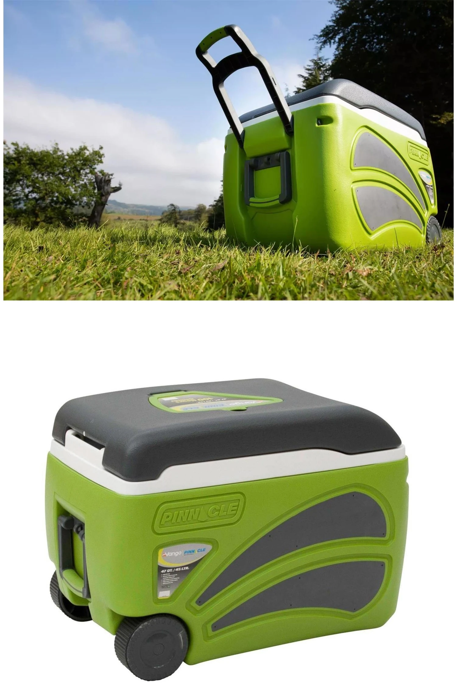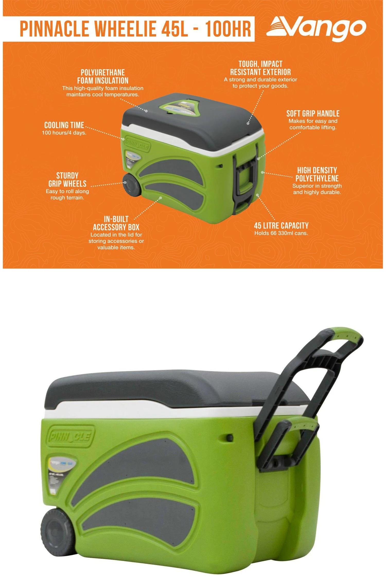The Vango Pinnacle Wheelie 45L cool box is ideal for picnics, parties or camping trips. Able to hold 66 cans, you are sure to fit everything in whilst its insulated body with polyurethane foam helps keep food and beverages cold for up to 100 hours. It features 2 small handles for carrying and a longer one with wheels on the opposite side for easy transportation.